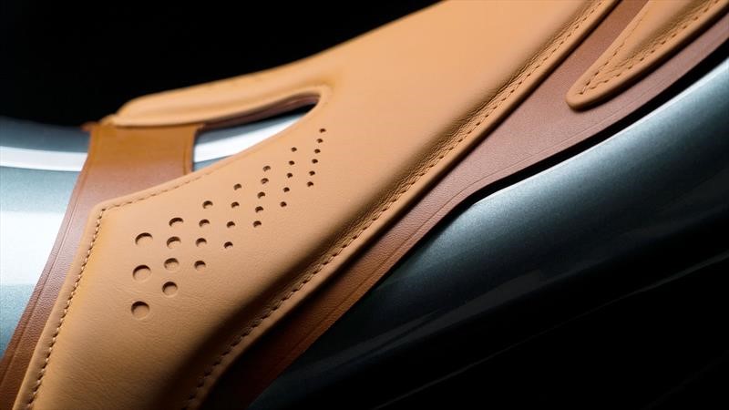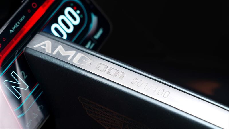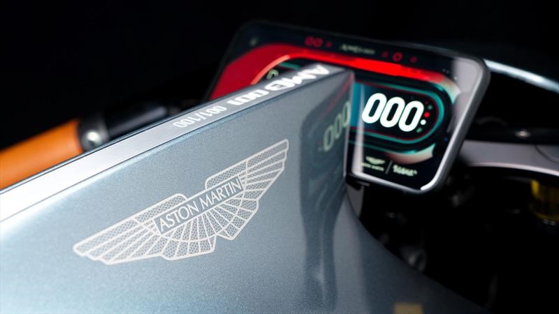 La identidad de Aston Martin está en todos lados, en especial por lo evidente, los colores verde Stirling y los acentos fluorescentes, contrastando con las llantas en negro mate, las piezas de fibra de carbono expuestas, el aluminio y titanio pulido, junto al sillín y manillar de cuero Oxford tostado. Entre la pintura y la laca, brillan al frente y en la zaga los emblemas de Aston Martin, fabricados en una pieza de acero inoxidable de apenas nueve micrones, tal como en el Valkyrie.
