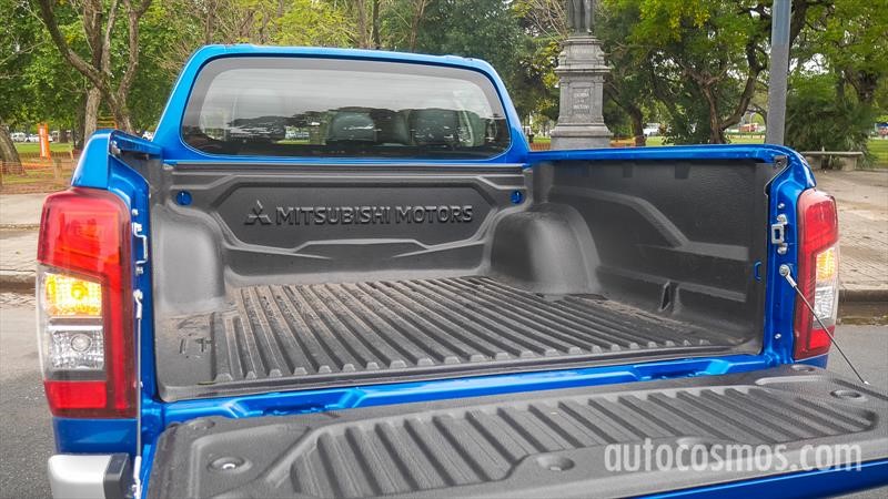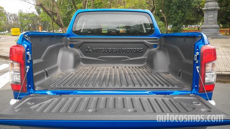 La caja de carga de la L200 mide aproximadamente 1,52 m de ancho (1,10 m entre guardabarros), por 1,42 m de profundidad y 46 cm de alto; y viene con protector.