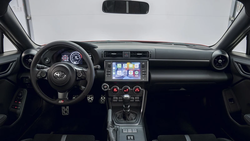 El ambiente deportivo en el habitáculo del GR86 se enriquece con el agregado de cuero y costuras de color rojo (por ejemplo en los asientos y el volante), y tapizado de Alcántara. Algunos interruptores en el tablero incluyen aluminio satinado, al igual que los del control de tracción (uno está destinado al uso del modelo en la pista). Otros detalles de la edición especial son: