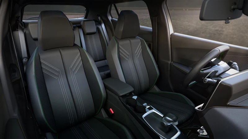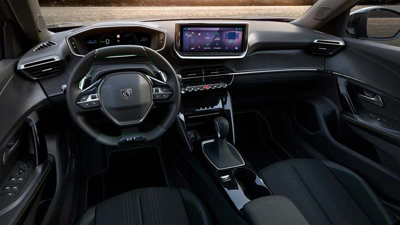 En el interior, se destacan elementos como las costuras en verde, apliques que simulan ser fibra de carbono, tapizados que combinan cuero y tela, además del clásico volante de base y parte superior "achatadas" de Peugeot. Sacando eso, la disposición sería la misma que la del 208, aunque se estrenaría una perilla de volumen, y el comando de los espejos tiene para rebatirlos eléctricamente.