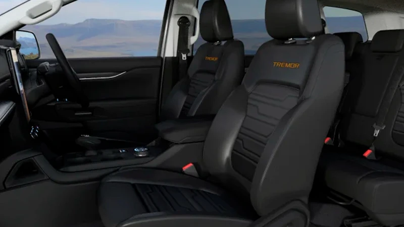 Puertas adentro, la Everest Tremor se destaca por los asientos de cuero negros exclusivos con el logo de la versión en los respaldos, además de unas nuevas alfombras, pero lo más importante es la capacidad para siete ocupantes, permitiendo que más gente se divierta con este SUV.