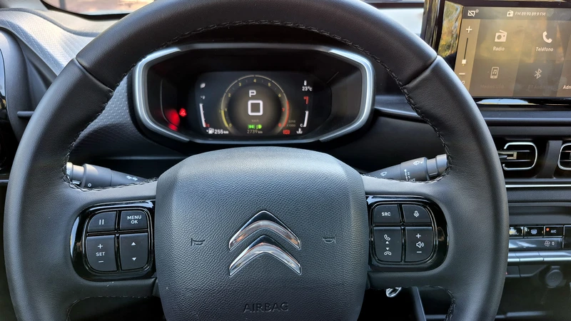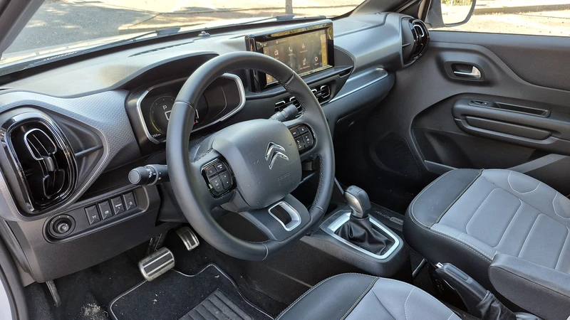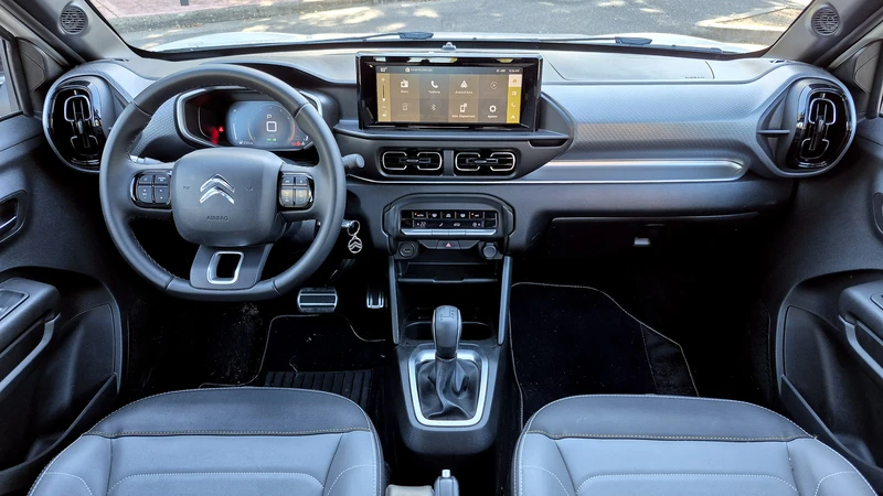 Los plásticos se sienten low cost, pero a su favor hay que decir que el ensamblado se percibe más sólido que en el saliente C4 Cactus. La practicidad es buena con varios portatutti, y las cosas están a mano, salvo la botonera del lado izquierdo donde, por ejemplo, se enciende el control de crucero que se regula desde el volante (más francés no se consigue).