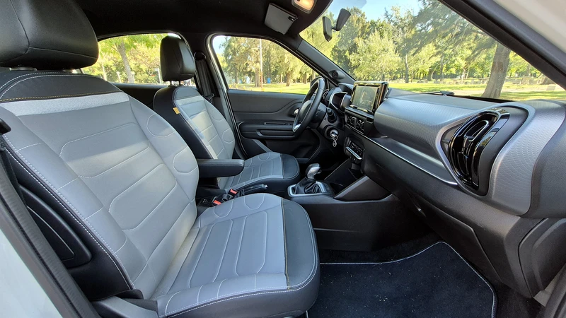 Entre esos elementos que le dan un poco más de nivel al Basalt están el decorado en tono arena del tablero, elementos en negro piano por aquí y allá, la bandeja en metalizado que se extiende por debajo de la pantalla y en esta versión el tapizado en símil cuero con detalles en tela y apoyabrazos en la butaca del conductor.
