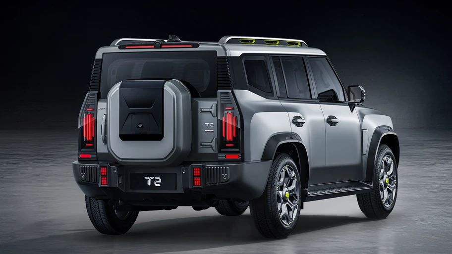 A nivel exterior, el Jetour T2 adopta un diseño mucho más robusto y aventurero que el T1, con estética “boxy”, líneas principalmente rectas, además de contar con elementos como paragolpes prominentes con ganchos de remolque, protectores de bajos en negro, barras de techo, y la rueda de auxilio “colgada” del portón, entre otros.