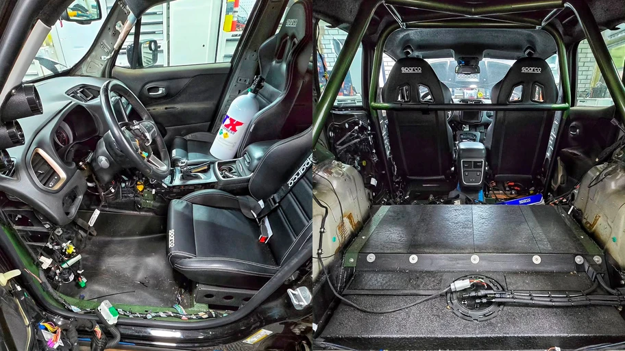 Entre las modificaciones del interior, se pueden mencionar elementos como el volante y tablero de Charger, las butacas deportivas de Sparco, los indicadores específicos en el parante A, además de luces en el techo a lo Rolls Royce. Además, se eliminaron los asientos traseros y se incluyó una jaula antivuelco. Por otro lado, Mike todvía está evaluando cómo integrar la pantalla multimedia y la consola central al tablero.